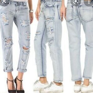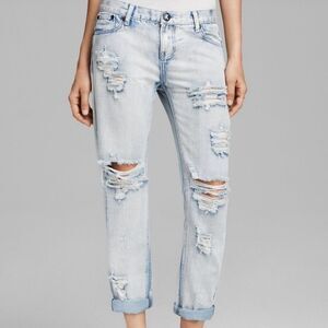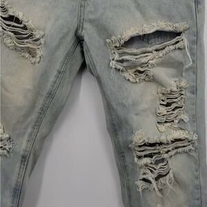 Stylish distressed jeans in a light blue shade. Perfect for a casual, trendy look.