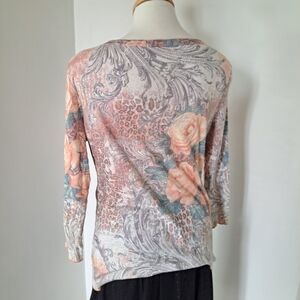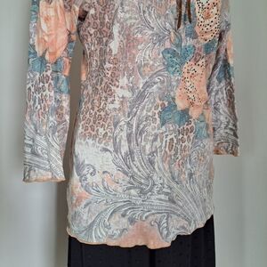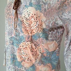 One world | Pink Rose colorful cropped sleeve shirt with rhinestones & front tie up. grandmacore style.