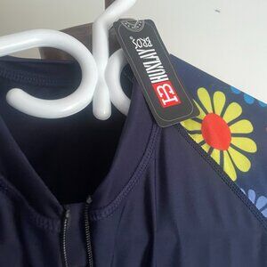 One-piece suit with a floral pattern skirt overlay and long sleeves for added sun protection