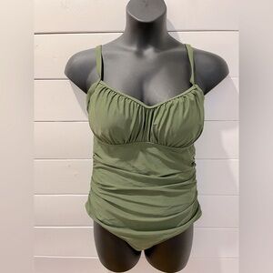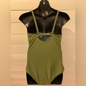 Flattering olive green one-piece swimsuit with ruched sides for a slimming effect. Features molded cups with light support, adjustable shoulder straps, and a stylish keyhole back with clasp closure. Elegant and supportive for fuller figures.
