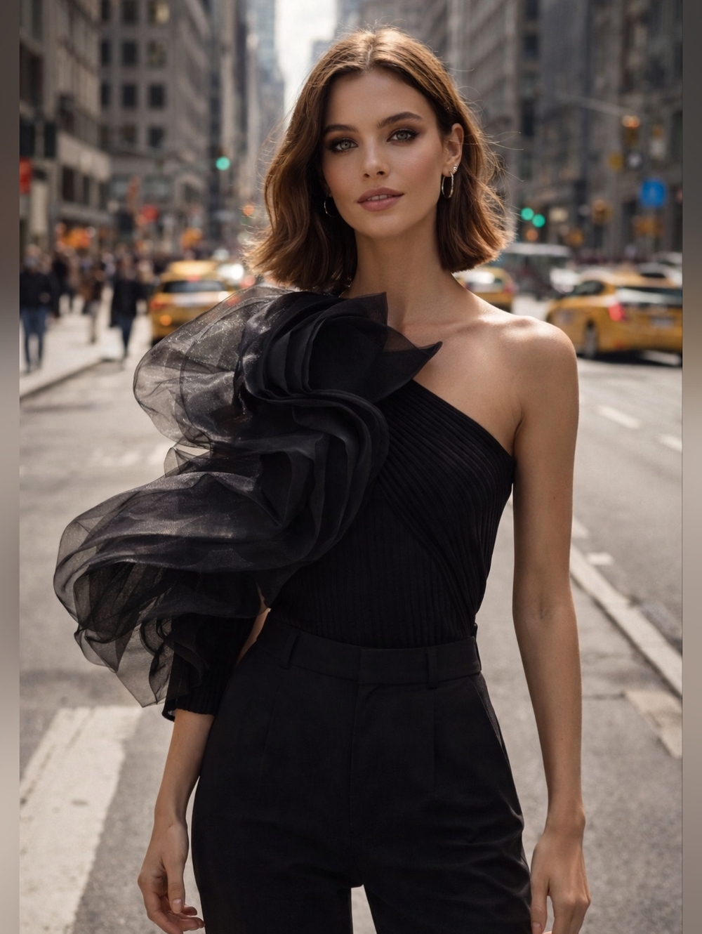 Sophisticated one-shoulder black dress with dramatic organza ruffle detail. Fitted bodice and sleek silhouette create an elegant, modern look. Perfect for evening events and special occasions. Features a single-shoulder design in black for standout style.
