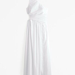 Flattering one-shoulder maxi dress in our classic poplin fabric, featuring asymmetrical neckline, trendy side cutout detail, thigh-high slit detail and a volume skirt. Imported.