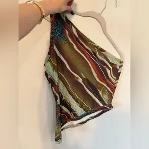 Stylish one-shoulder top with a vibrant multicolor pattern. Perfect for a bold look.