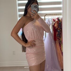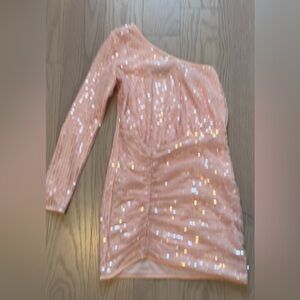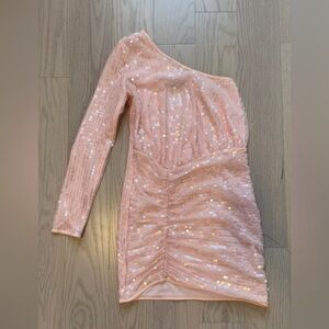 Step into the spotlight with this elegant one-shoulder pink sequin mini dress. This eye-catching dress is perfect for any special event or party, offering a flattering fit for size Small.It’s been worn twice , it features shimmering sequins and a chic one-shoulder design that exudes sophistication and style.