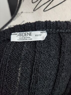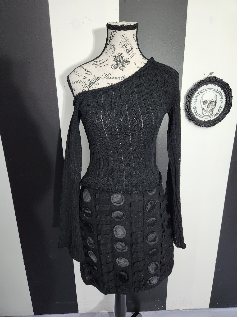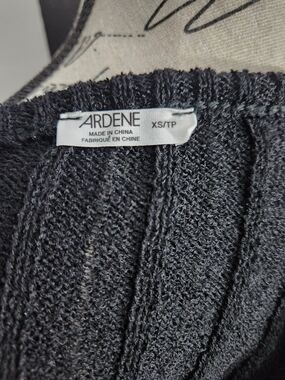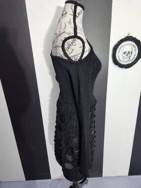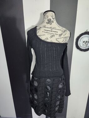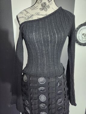Soft knit off-the-shoulder design. Ribbed texture with long sleeves. Slim, fitted silhouette. Classic black color for versatile styling.