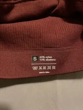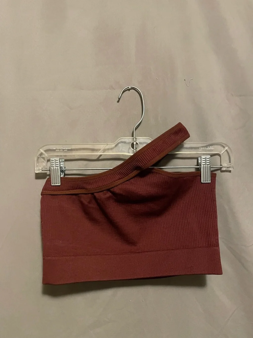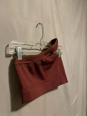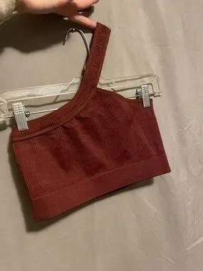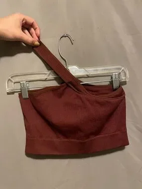 Sleeveless one-shoulder ribbed tube top. Stretchy knit fabric with wide banded hem. Versatile cropped silhouette in a warm brick red tone.
