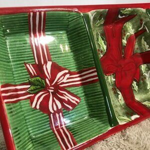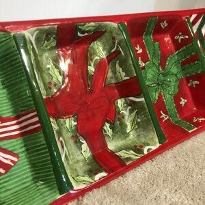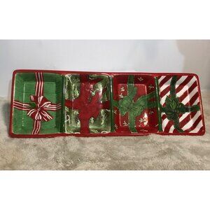 Oneida Ceramic Holiday Serving Tray Gift Box Design 4 Sections Red Green 18 X 6"