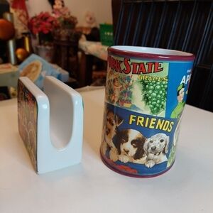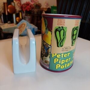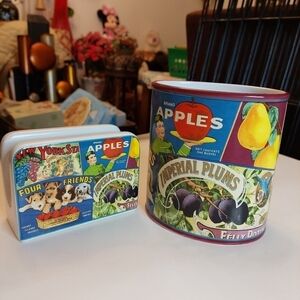 Oneida Vintage Labels Medium Oval Stoneware Cookie Jar/Canister (no lid) plus matching Napkin Holder. Approx 3.5" and 5.5" tall. Multi vintage labels repro on these great stoneware items.