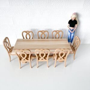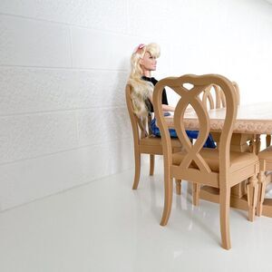 Transform your dollhouse dining room with this stunning 1:6 scale miniature oak dining trestle table and 8 chair set, perfect for Barbie, Integrity, and other 12" fashion dolls. Meticulously crafted for the discerning adult collector, this set is a blend of cutting-edge 3D printing technology and traditional craftsmanship.