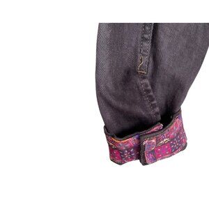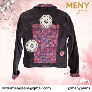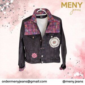 Turn heads in this stunning custom creation. This faded black denim jacket has been artfully upcycled with vibrant mandala-patterned inlaid fabric and accented with handcrafted crochet appliqués, each one meticulously handsewn for a truly unique finish. A bold statement piece that blends boho charm with edgy style — no one else will have one like it. Stand out, effortlessly.
