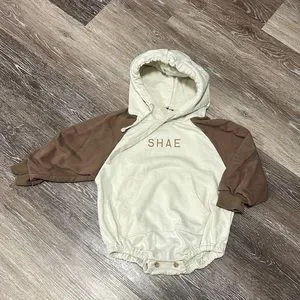 Unique neutral colour hoodie onesie with the name “Shae” written on the front.
