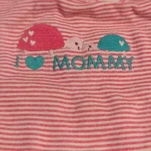onesie that says I love mommy with two turtles on it one turtle is pink one turtle is green pink and white stripes button up at the bottom short sleeve brand just one you by Carters size 3 months