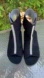 Onex Leather Tuxedo Heeled Sandal Black Sz 9/9.5, 100% soft suede upper with rhinestone embellishments, Mirrored trim and back of heel. 3 % 1/4" heel, Velcro closure at ankle, padded footbed. Will fit shoe sz 9 to 9.5. Sandals are in very good, preloved condition with some minor marks on the upper pictured in photos, please view all photos. From a smoke free pet free home.
