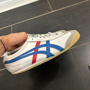 they are original from Japan brand, regular white colour mixed with 2 lines red and lines known as its signature logo, are made by leather material, have preserved in good condition and tough shape. I've been using them for a year; a point to attention is Onitsuka tiger from Asics company only shows men sizing that means if women want them, mentally convert men's size to women's size. some saying should up to 1.5 to 2.