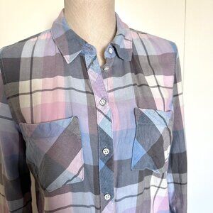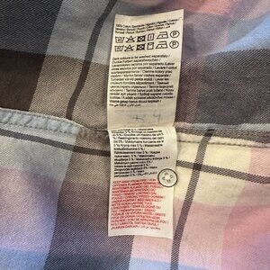Pastel pink and blue plaid button down shirt with 2 front pockets