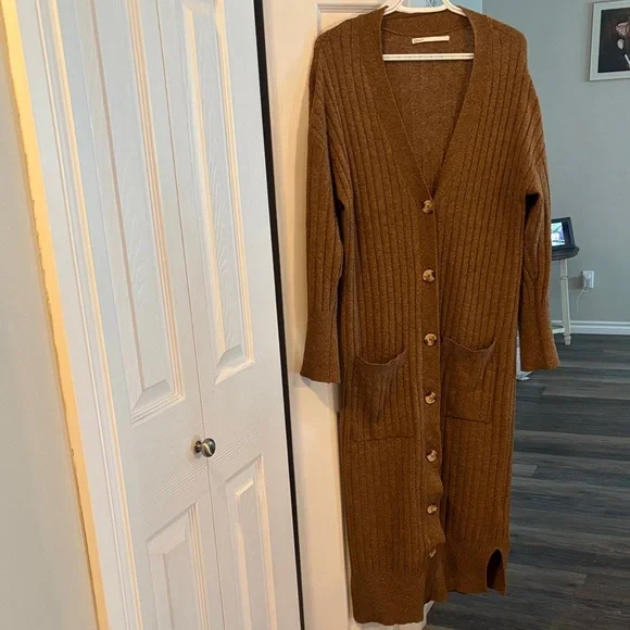 Cozy brown ribbed cardigan with button-down front. Features practical pockets. Ideal for layering. Very good condition only used. Has side slits on the bottom