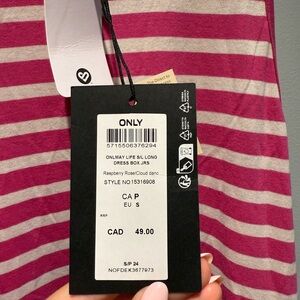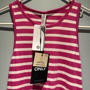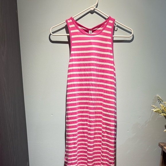 Stylish maxi dress with pink and white stripes. Sleeveless design. Perfect for casual outings.