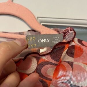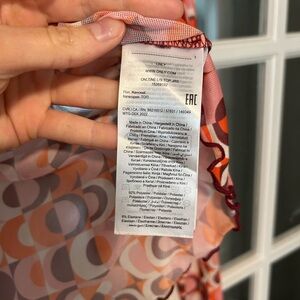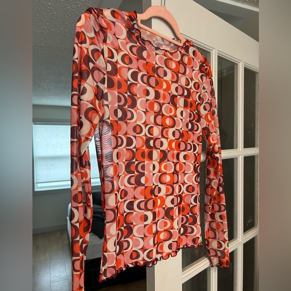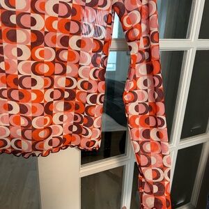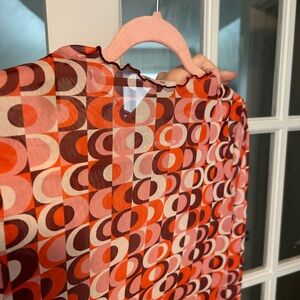 Chic top with a bold geometric design. Features a mix of orange, pink, and cream hues. Size is medium—I would say it fits on the smaller side of medium. Lettuce hem and sleeves.
