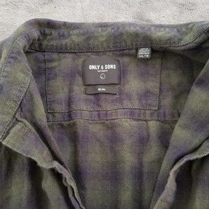 Gently worn, super soft and comfy, with a flannel-like feel. Pattern is subtle checkered. 100% cotton. Extra buttons included. Color is forest green and a blue/purple.