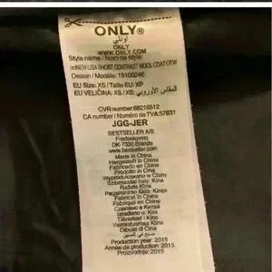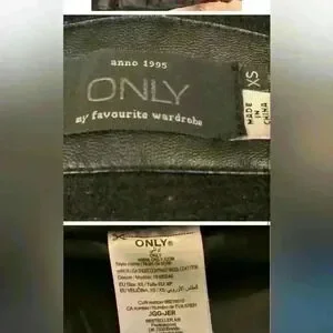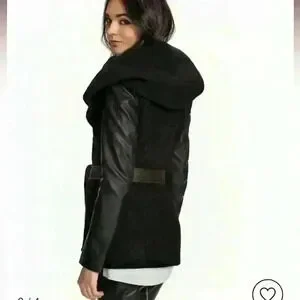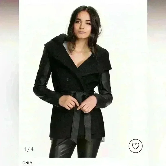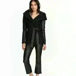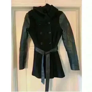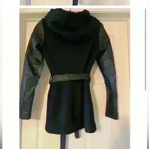 Wool coat with button front and faux leather sleeves and tie. Fits like a small