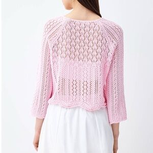 Only light pink openwork pointelle lace sweater new with tags. Flared long sleeves, scalloped hem, fine openwork crocheted knit in 70% recycled cotton and 30% polyester, straight fit. So airy and feminine! Colour is accurate in the stock photos, mine are taken in artificial light. Marked size L Large. All measurements are approximate and taken with the garment laying flat: Pit to pit 19’’ Total length 18’’. This item comes from a smoke free, pets friendly home. Recycled bags/box used when possible. Please, let me know if you'd like any additional info. Thanks for watching!