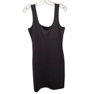 mini dress designed to fit snugly and highlight the body’s shape. It features a scoop or square neckline and has a simple, plain design without additional embellishments. The dress is mini length, falling above the knee, and is sleeveless with tank-style shoulder straps.