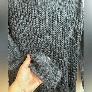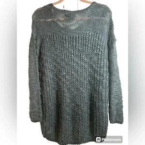 Welcome to your Cozy Era! Longer oversized loose knit sweater, first photo is true color, navy, yarn has a fuzzy halo, high-low hem. A bit of a scoop neck,m. Has a casual slouchy comfy style!! Size Medium (**first photo is true color**)