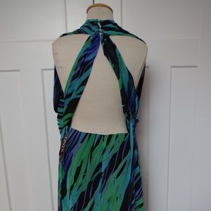 Brand new maxi dress with attached faux shawl, built in bra cups and interesting back detail. Originally retailed for $179 US at Macy's.