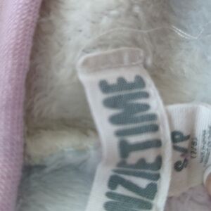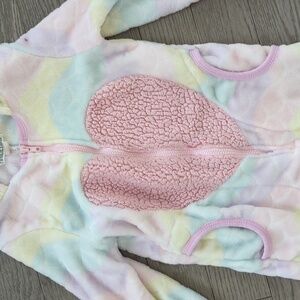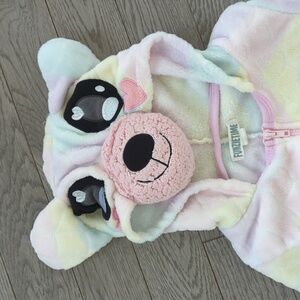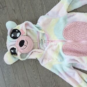Charming one piece front zip with bear hood. Soft pastel hues. Cozy and fun.