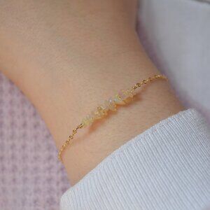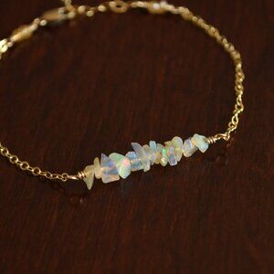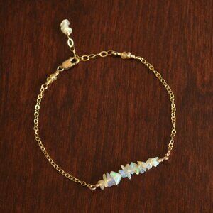This real opal bracelet is simple in style, but so very pretty. In this piece, a row of small opal gemstones is centered on dainty gold filled chain. The stones are chips, which have an interesting, irregular shape. More tiny gemstones decorate the clasp section and the end of the extender chain. I like this bracelet stacked with others for a casual look. This bracelet is ideal for women who want something lightweight and easy to wear this summer.