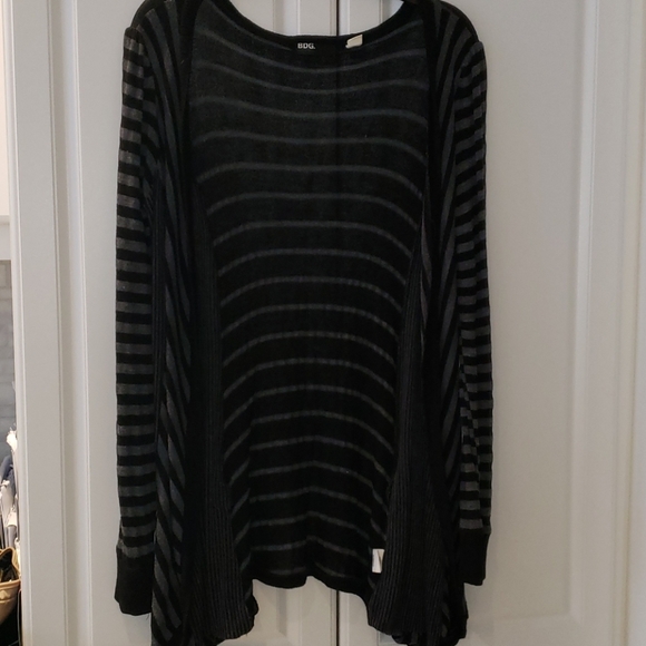 Gently worn, black and grey striped open flowy cardigan with pockets