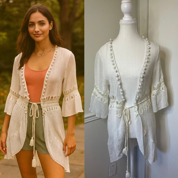 Open Front Boho Pom Pom Duster/Cardigan P2P 17"