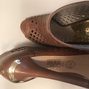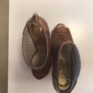 Michael Kors Graham’s open toe caged bootie. Gold hardware/ back zipper. Platform style. Carmel colour. Size 8.5. Heel 5.5 inc. 1 inch front platform. Leather. Great condition. Gold Michael Kors embossed heel hardware. Only worm 2-3 times. Very comfortable for high heel and stays put.