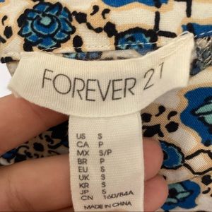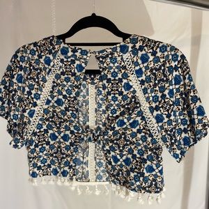 Forever 21 blue and white crop top with an open back, tassels that hang from the bottom. White stitching in middle and sides of chest are see through.
