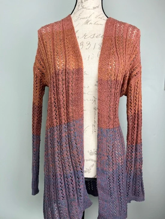 Pretty open-front cardigan in a rust to blue/purple gradient. Versatile layering piece that pairs well with casual or dressy outfits. Easy, relaxed fit designed for everyday wear.