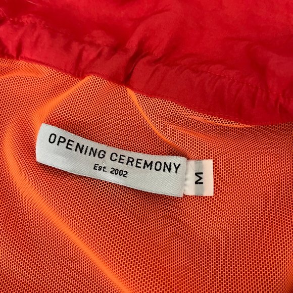 Like-new condition. Very bright red jacket. Perfect for spring. Soft feel, 81% Modal / 19% Nylon, but has a bit of a seersucker look and feel to it. Collar can be unbuttoned. Waist buttons to toggle the fit. Slightly cropped length (kind of like a trucker jacket).