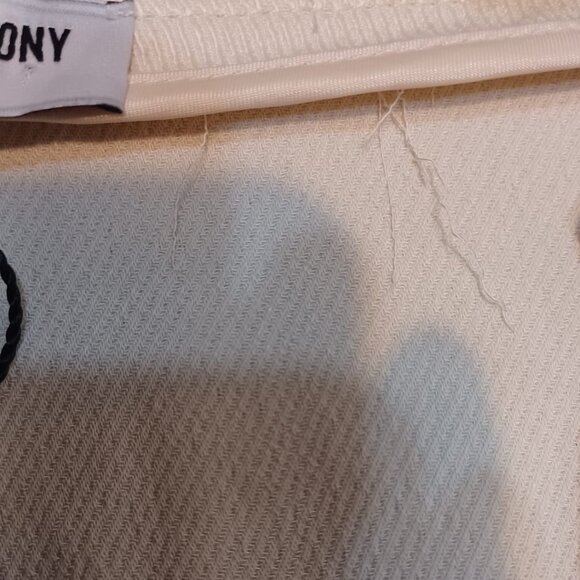New with tags deep u-neck cream-coloured tunic, featuring a tie-back and two front flap pockets. Thick viscose fabric with small pulls at the inside of the neck, and beside the front pocket and along the seams (see photos). Size 0, but oversized fit and fully adjustable at the waist, due to the tie-back.