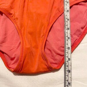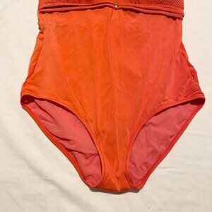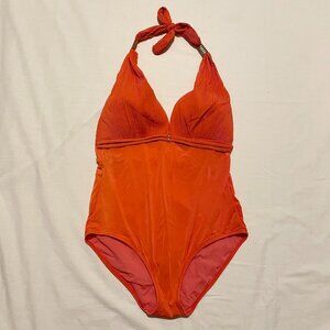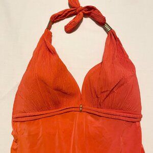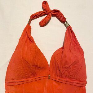 Gorgeous halter neck one piece swimsuit, a orangey-red, very flattering, with delicate gold accents. Made in Germany. Unfortunately it does not fit my long torso.