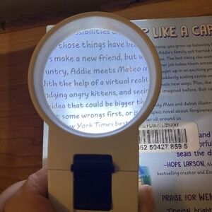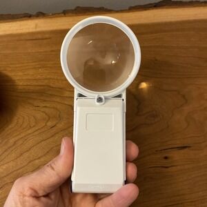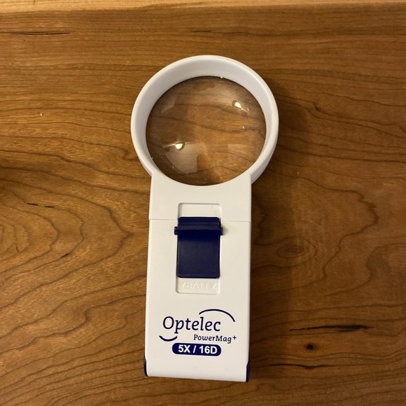 Optelec Power Mag 5X LED Handheld Lighted Magnifier. Great working condition. There is a scratch on the lens but it doesn't seem to distort images under magnification when tested.