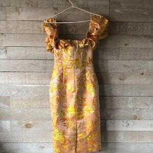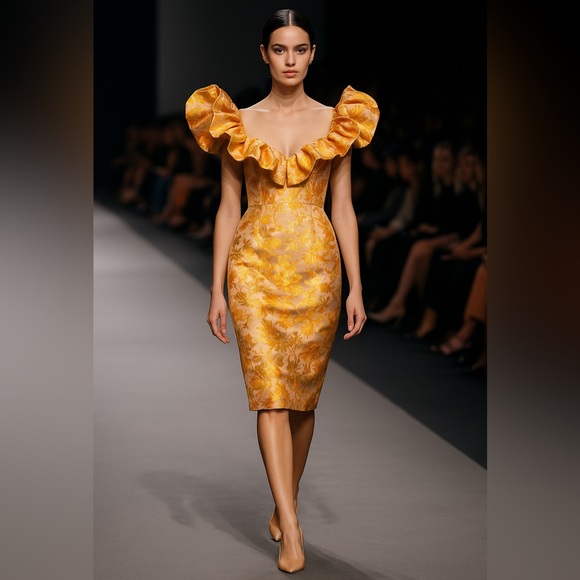 Turn every head in the room with this breathtaking peach, yellow and silver brocade statement dress crafted from a luxurious metallic jacquard fabric. This dress features, a stunning floral baroque pattern that catches the light beautifully with every movement. The structured silhouette highlights the waist and creates an elegant hourglass shape, while the dramatic sculpted ruffled neckline as couture level, drama and sophistication.