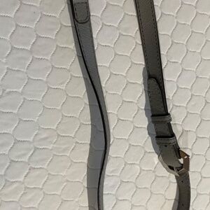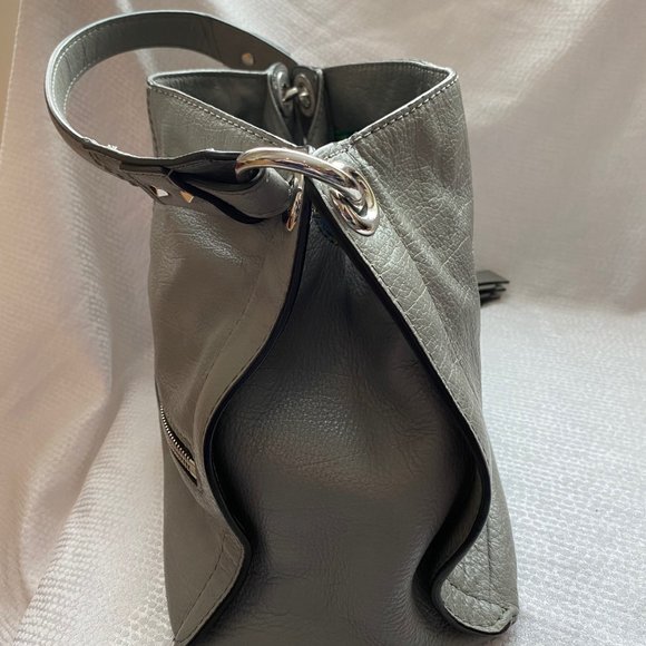 Beautiful OrYANY dark grey leather handbag/shoulder bag with chunky silver tone hardware. Excellent condition, used twice, no marks. Chunky removable adjustable 3/4" leather shoulder strap with silver tone buckle. Leather handle 17"L x 1"W, bag measures 10 1/2"W with 4 feet on bottom x 10 1/2"H. Magnetic back pocket 6"L, chunky zip front pocket 10"L, removable 11 1/2" hang tag with 6 leather straps & silver tone ORANY symbol, 2 inner zip pockets trimmed in leather, 1 inner full zip pocket & 2 pouch pockets, all trimmed in leather, also includes a 36" adjustable cross body strap 3/4" wide. Bright green patterned lining. Dust bag included, smoke free home. Absolutely stunning modern leather handbag/shoulder bag.
