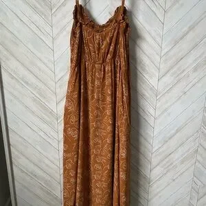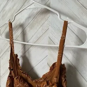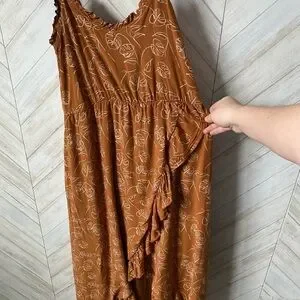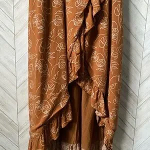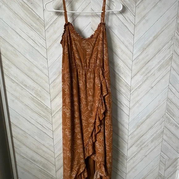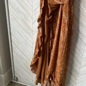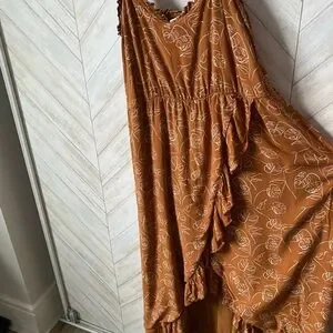 This vibrant orange sundress features an asymmetrical ruffled design with a wrap style, perfect for resort wear. The sleeveless dress is accentuated by delicate spaghetti straps, offering a chic and breezy look. This gorgeous dress has a slit up the middle so was able to be used for maternity shoot as well as beautiful regularly.