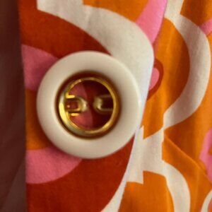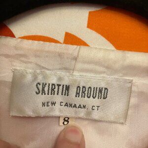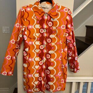Is this the most fun coat ever? Bold orange pattern, big white buttons, pockets, small shoulder pads for shape. VGUC, slight discoloration on lining at the collar (see photos). Brand is Skirtin Around, size 8. Lightweight for fall/spring.