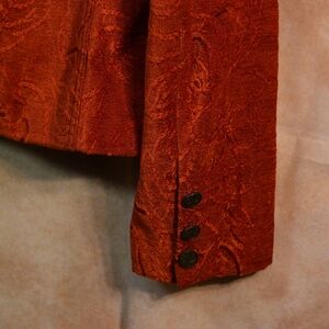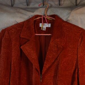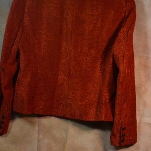 The fabric on this lovely jacket feels soft and velvety with a raised pattern. It is lovely. Sz 14 by Conrad C