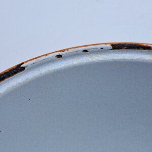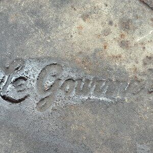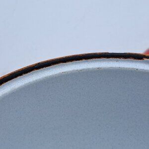 A heavy cast iron pot with orange enamel and lid in the style of Le Creuset made by Le Gourmet. The interior enamel is intact though there are chips on the rim. The interior has minor crazing.