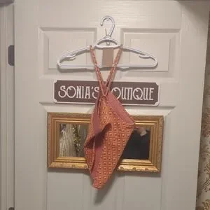 Stylish orange halter top with a geometric pattern. Perfect for casual outings.