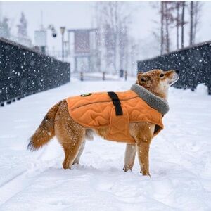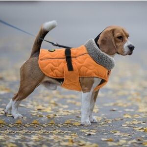 Stylish orange quilted dog coat with a gray collar. Includes a red and black plaid dog onesie. Perfect for keeping your pet warm and fashionable.