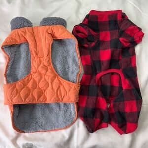 Orange Quilted Dog Coat and Red Plaid Dog Onesie