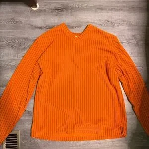Vintage fleece ribbed sweatshirt. Slight V-neck. Orange with black stripes. Kind of gives a referee vibe. See the end of the photos for measurements. This is very warm and super comfortable, just cleaning out my closet!