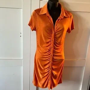 Stylish orange dress with ruched detailing and button-up front. Perfect for a chic look.